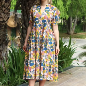 2025 여름 여자의 V-넥 원피스 보헤미안 스타일 휴일 랜턴 짧은 소매 무릎 길이 느슨한 버전 새로운 디자인 캐주얼 드레스